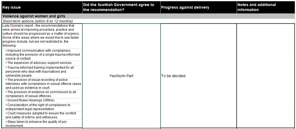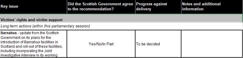 We have collated these actions into an Action Plan (Annex A). This Action Plan will be used to monitor the progress of the delivery of improvements by the Scottish Government and other bodies. Our intention is to update this Plan at regular intervals in this parliamentary session.