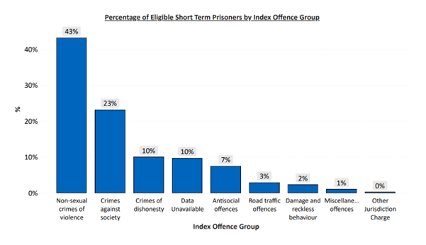 In Annex B, Table 3 shows a percentage breakdown of eligible short term prisoners by Index Offence Group and Table 4 shows the number of eligible short term prisoners by Index Offence Group.