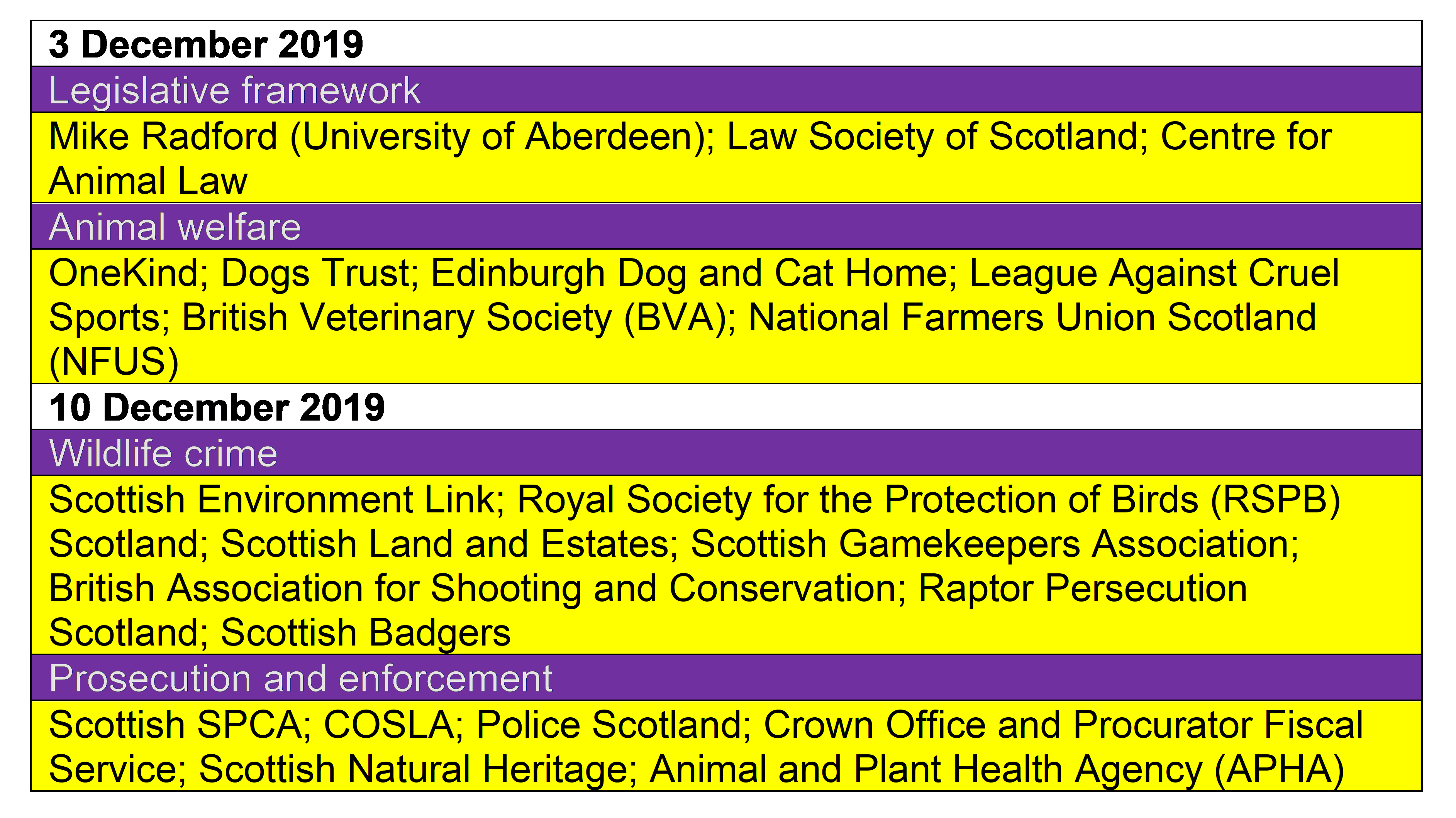 Ian Thomson, Head of Investigations, RSPB Scotland; Karen Ramoo, Policy Adviser, Scottish Land and Estates; Ross Ewing, Political and Press Officer, Scotland, British Association for Shooting and Conservation; Dr Ruth Tingay, Raptor Ecologist, Raptor Persecution UK; Eddie Palmer, Chairman, Scottish Badgers; Les George, Gamekeeper and Scottish Gamekeepers Association Committee member, Scottish Gamekeepers Association; Liz Ferrell, LINK Wildlife Crime Subgroup Convener and Scottish Officer, Bat Conservation Trust, SE Link; Mike Flynn, Chief Superintendent, SSPCA; Detective Chief Superintendent Gary Cunningham, Specialist Crime Division, Police Scotland; Constable Charlie Everitt, Scottish Investigative Support Officer at the UK National Wildlife Crime Unit; Robbie Kernahan, Head of Wildlife Management, Scottish Natural Heritage; Joanne Fairman, Head of Regulatory Affairs, Animal and Plant Health Agency; Sara Shaw, Head of Wildlife and Environmental Crime Unit, Crown Office and Procurator Fiscal Service.