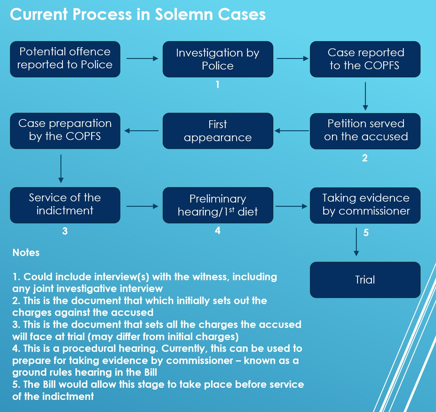 The main provisions of the Bill create a rule, applying to child witnesses and complainers (i.e. alleged victims) involved in the most serious cases, which would generally require all of the child's evidence to be given in advance of the trial. This would be done using a prior statement and/or taking evidence by a commissioner. The rule would not, however, apply to child accused.