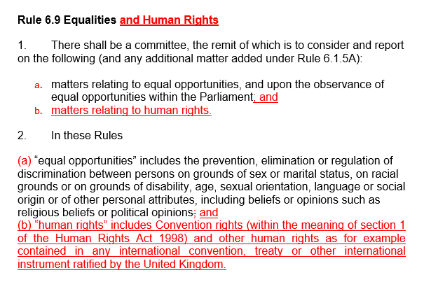 amend Standing Orders to make the Equalities and Human Rights Committee a mandatory Committee of the Parliament, replacing the former mandatory Equalities Committee.ii