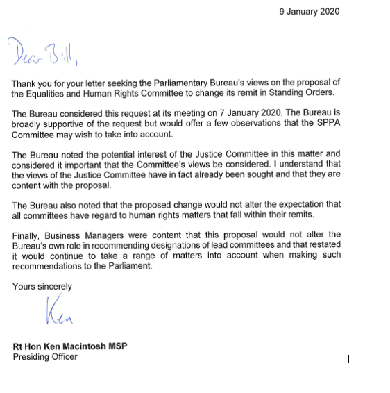 As the Committee responsible for the practice and procedures of the Scottish Parliament in relation to its business, I am writing to ask the Standards Procedures and Public Appointments (SPPA) Committee to amend Standing Orders in relation to human rights.