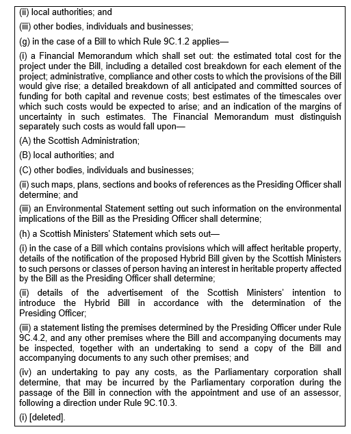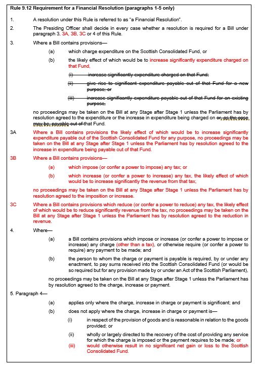 Rule 9.12 – which sets out the requirement on the Presiding Officer to decide in every case whether a Bill requires a financial resolution, and sets out the criteria to be applied in determining whether a resolution will be required.