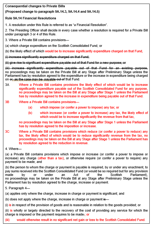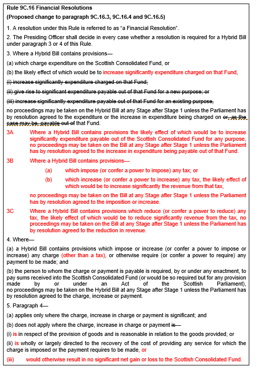 The proposed paragraph 3B in effect makes explicit the interpretation that has been applied to taxation Bills to date. The proposed paragraph 3C adds additional flexibility to consider measures that result in reduced tax revenues (by, for example, abolishing a tax or by creating or extending a tax relief). The changes proposed at paragraphs 9-16 above in regard to Financial Memorandums will work in conjunction with this, with the express requirement for the Memorandum to deal with changes in revenues.