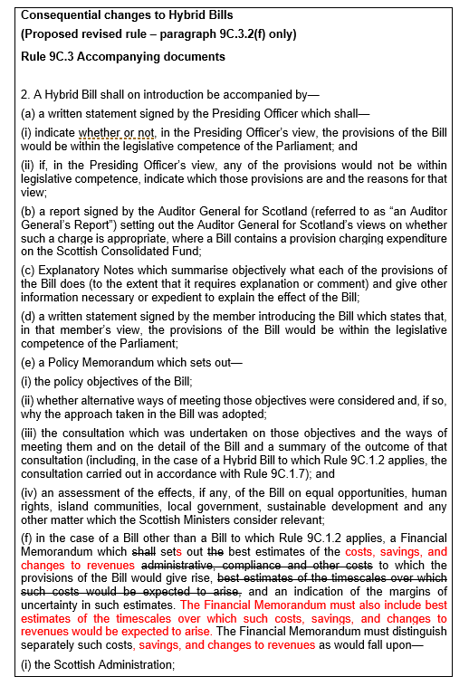 In my view, the proposals seem proportionate and reasonable, and would assist in committee scrutiny. I therefore agree with you that the proposed changes to Rule 9.3.2 will strengthen the requirements for the provision of information in the Financial Memorandum and therefore support improved scrutiny of the savings and changes to revenues, as well as to costs that will result from the Bill.