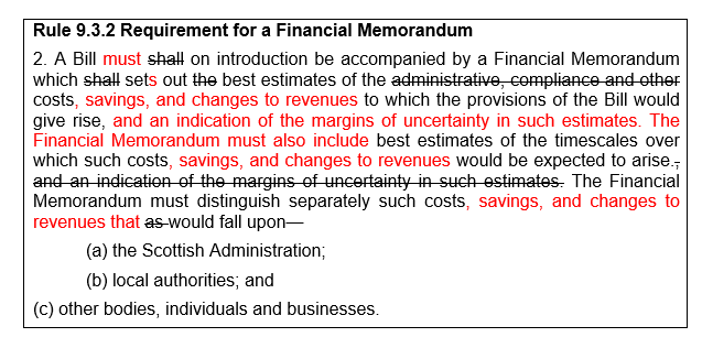 The proposed revision requires that the Memorandum sets out best estimates of "the costs, savings and changes to revenues to which the provisions of the Bill would give rise". Other changes to the wording of the rule are simply to make this change sit in context in as readable a manner as possible and do not involve any other changes of substance.