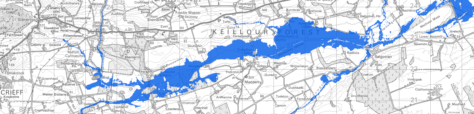 The map below is reproduced from the SEPA interactive flooding map, which indicates areas of Scotland at risk from flooding. It is possible to look at localised areas at risk of flooding in detail [here], and this may provide useful context.