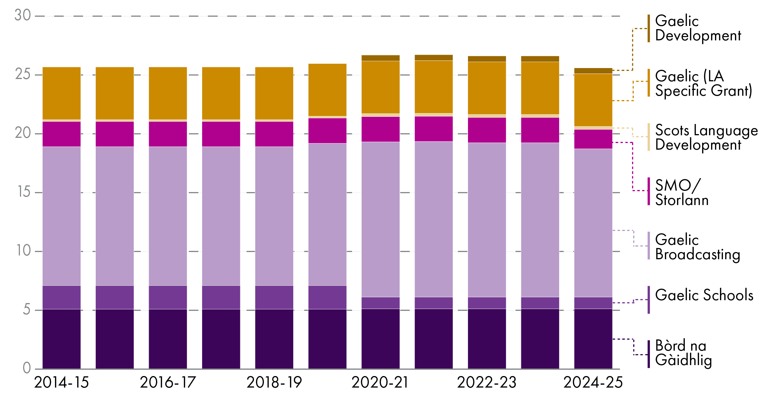 Taen thegither, direct Scottish Government fundin fur day tae day spendin on Scots and Gaelic has been maistly siccar and stable in cash terms ower the past ten year. This represents a real terms faw. Forby resource fundin, there is a Capital budget unner Gaelic fur tae support local authorities in providin Gaelic Medium Education. This has been heezed in recent years and stauns the noo at £4m per year.