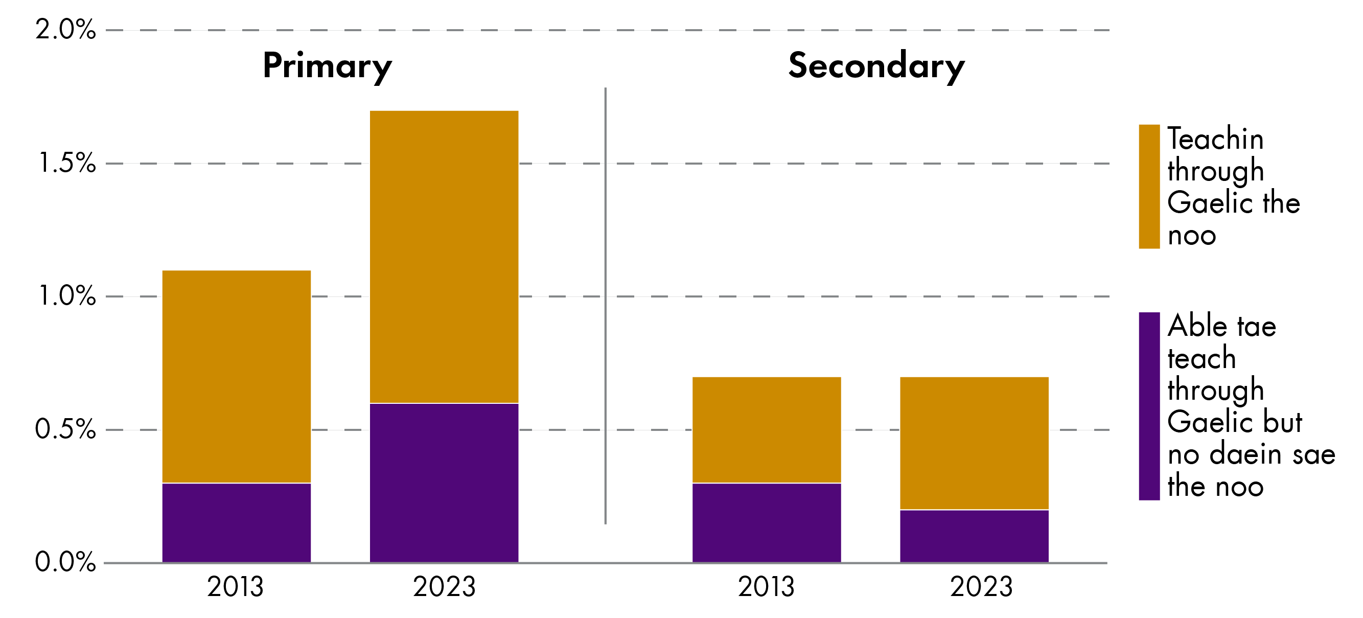In the past ten year, there has been an increase in the nummer o schuil bairns takkin pairt in baith GME and GLE. There has been an increase forby in the nummer o teachers whae are teachin through Gaelic, or whae potentially could teach through Gaelic, the noo.